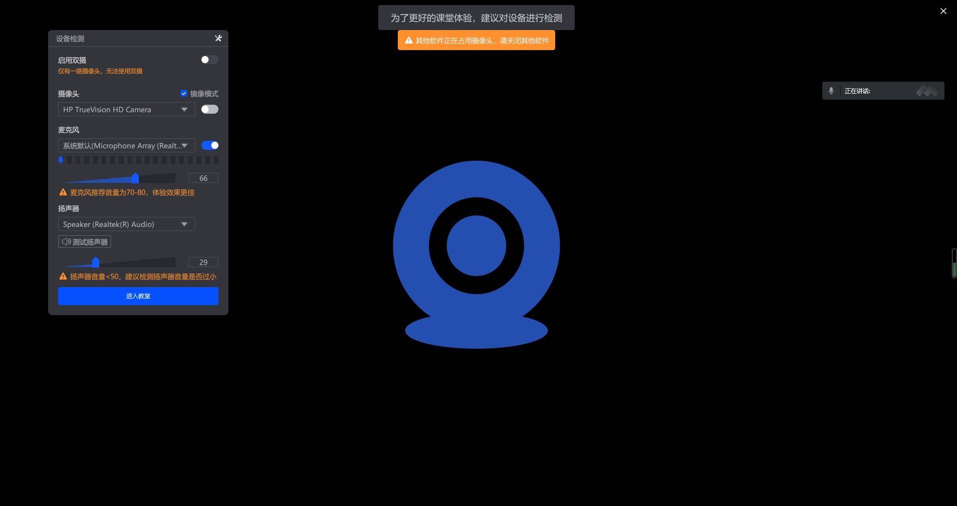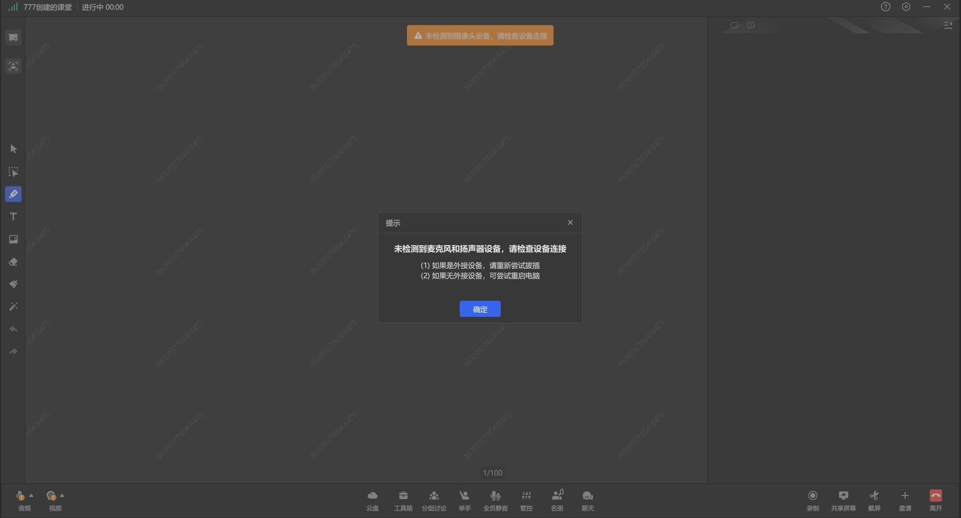 用户自己的管控栏/人像视频上对应的麦克风/摄像头图标显示为异常,点击可查看问题出现原因及操作提示。