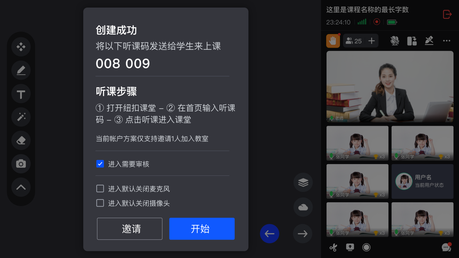 增加进入教室默认关闭麦克风/摄像头的管控功能,支持讲师对学员加入教室的设备开启/关闭状态状态进行管控,该管控将对之后进入教室的学员生效。讲师勾选该设置,之后进入教室的学员将默认关闭麦克风/摄像头,课堂过程将不受打扰,有效保障课堂进度的有序进行。