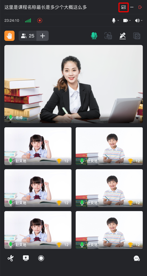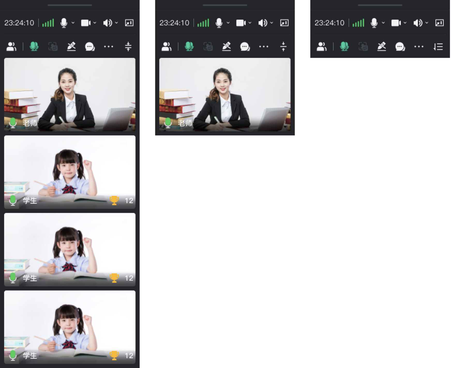 教室新增坐席区悬浮模式,点击坐席区设置按钮,可将坐席区设定为悬浮模式,悬浮模式下可自由拖动坐席区窗口,可切换悬浮窗口形式(坐席显示:主讲席位+成员席位、仅显示主讲席位、隐藏所有席位);