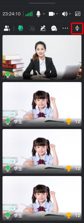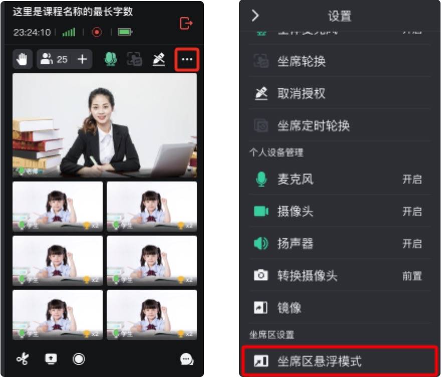 点击班级管控区域的【更多】按钮,在二级菜单中选择【坐席区悬浮模式】,进入坐席区悬浮模式;