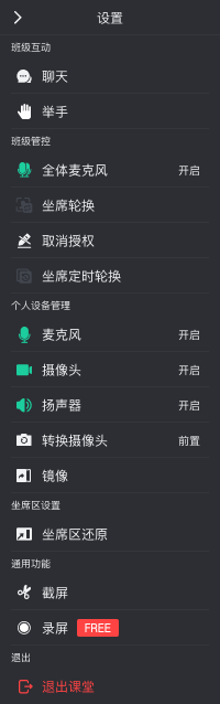 在悬浮模式下,将讲师端的【聊天】、【举手】、【坐席区设置】、【截屏】、【录屏】、【退出课堂】等功能按钮放置在【更多】的二级菜单中;