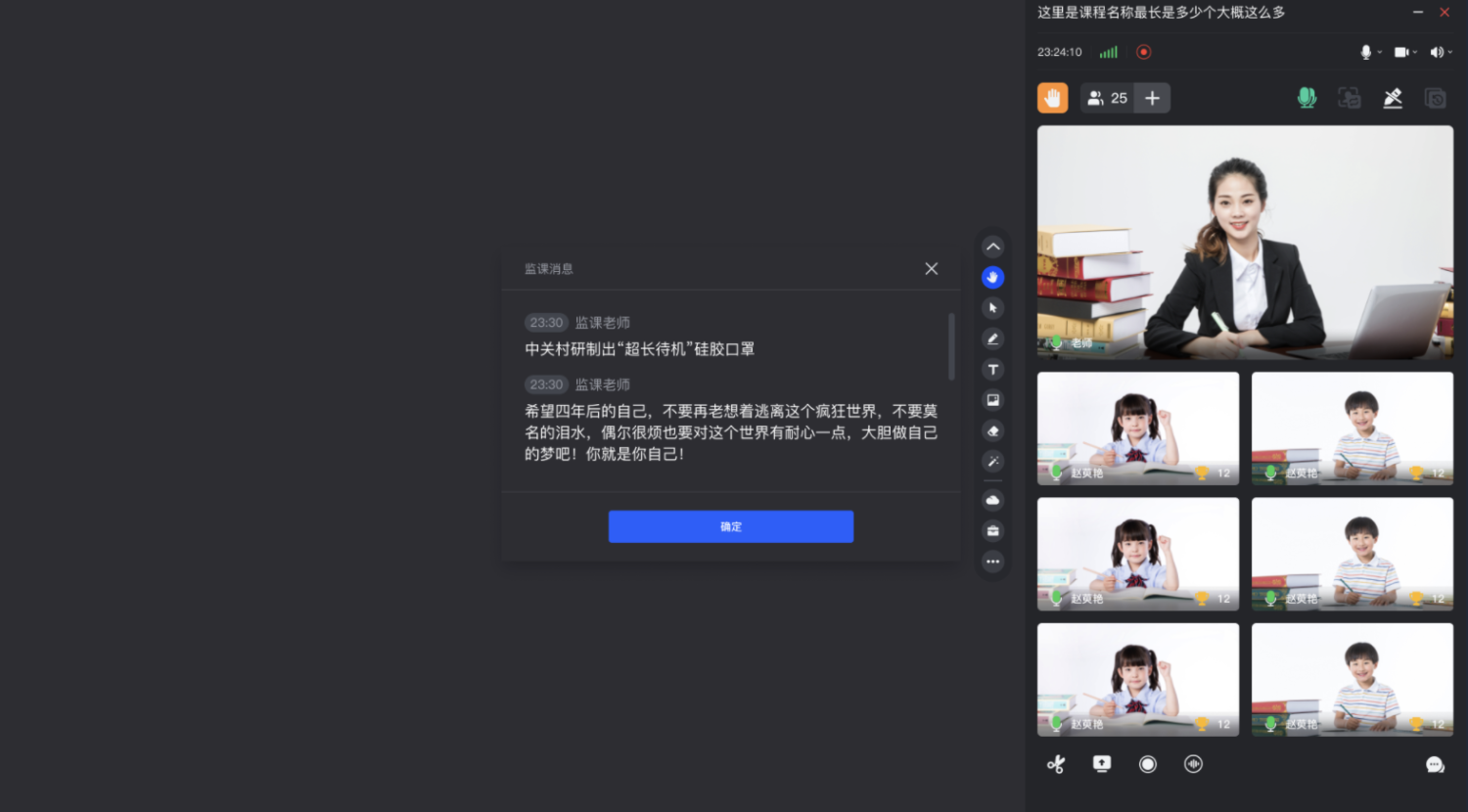 监课在后台向正在上课中的讲师发送消息,讲师在课堂中接受监课消息,以弹框的形式展现消息详情。点击确定监课消息消失,不做保留。如若连续多条消息,以消息列表的形式展示。