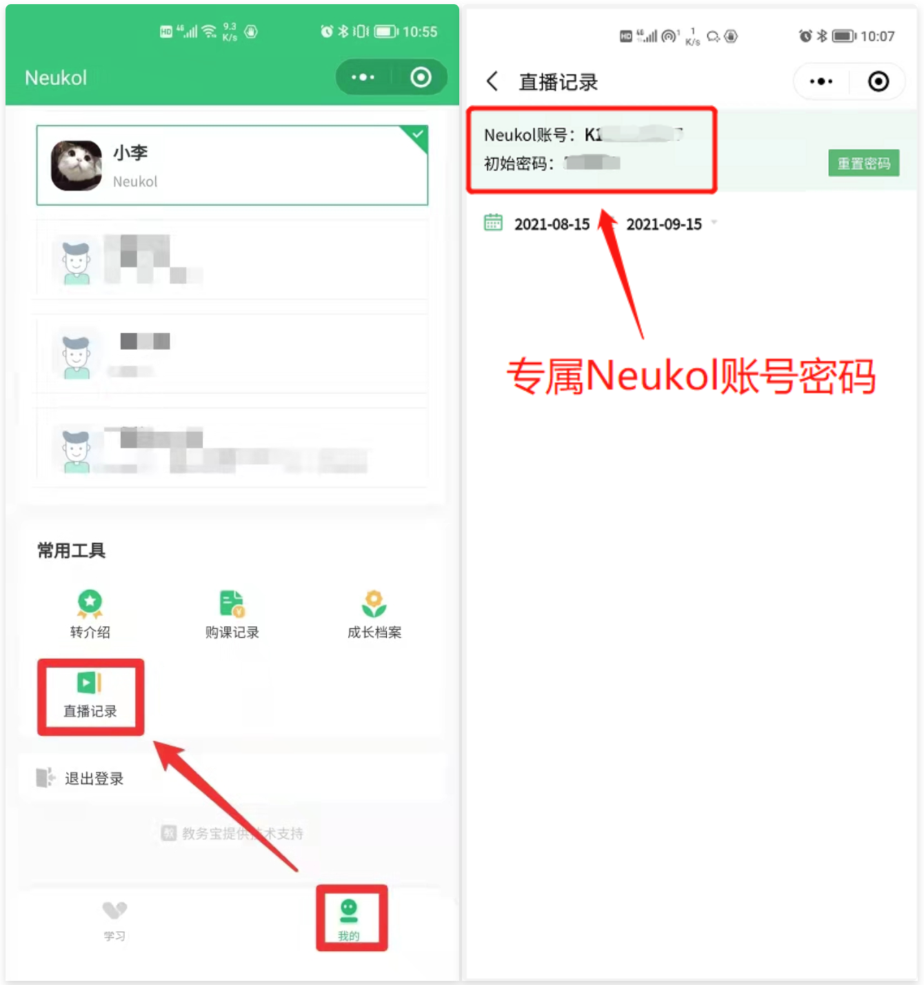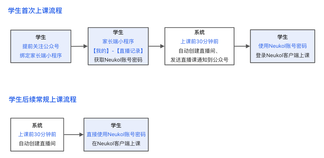首次使用直播上课,学生可以从家长端小程序获取专属Neukol账号密码。
