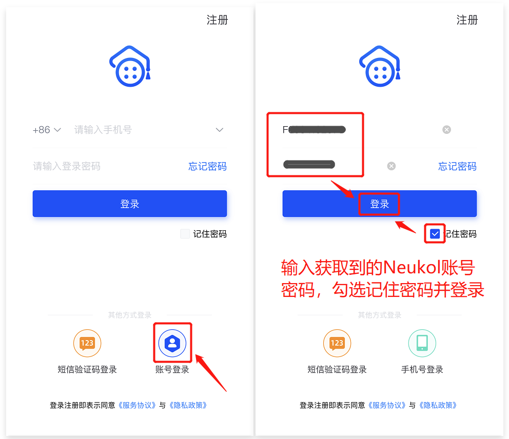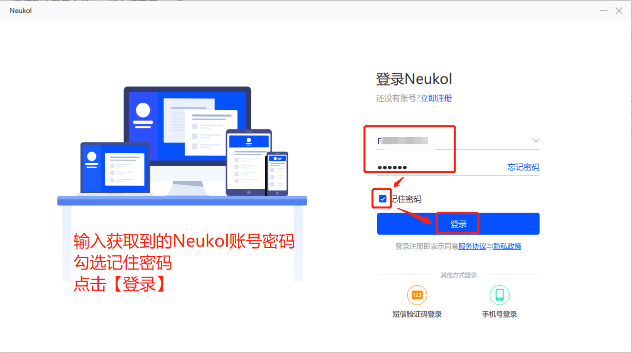 1、打开Neukol客户端,选择账号登录,输入获取到的Neukol账号密码。