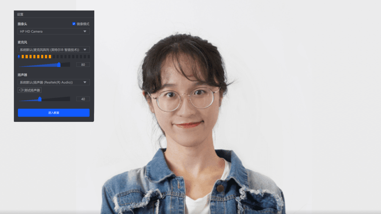 (学生可以外接摄像头、麦克风等音视频设备,在下图这个设备检测页面就可以进行切换,也可以在这里对麦克风、扬声器音量进行调整,麦克风音量建议控制在70-80之间。)