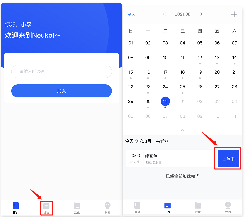 2、点击【日程】,可以看到30分钟内即将开始的课堂,到时间点击【上课】即可入课。