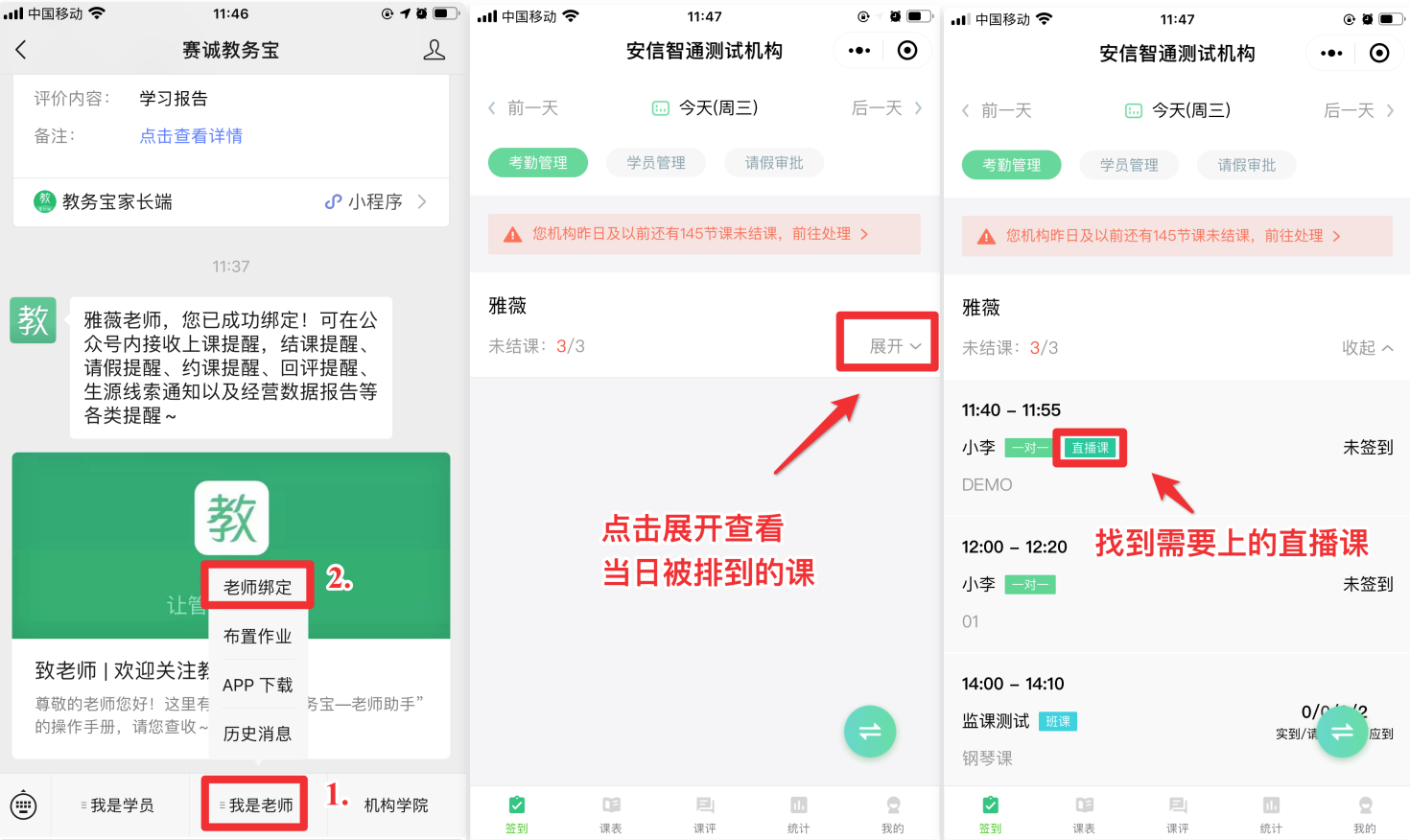 第一步:手机在教务宝公众号,点击我是老师-老师绑定,选择正确的日期-找到需要上的直播课。