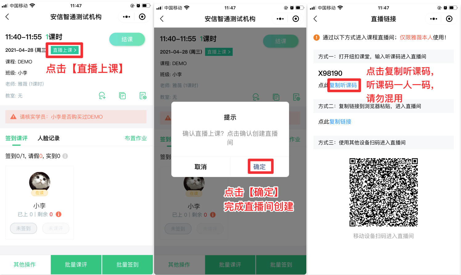 第二步:点击【直播上课】完成直播间创建,并获取听课码。