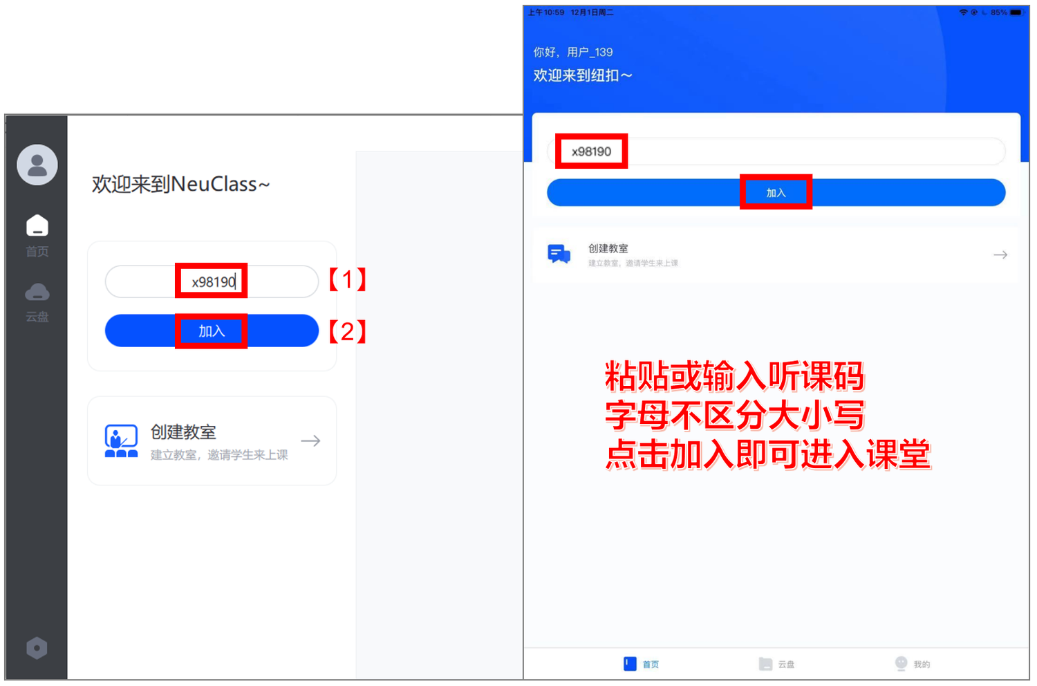 第三步:在电脑或iPad端打开纽扣课堂APP,粘贴或输入听课码,点击【加入】即可进入课堂(首次使用需进行注册登录)。