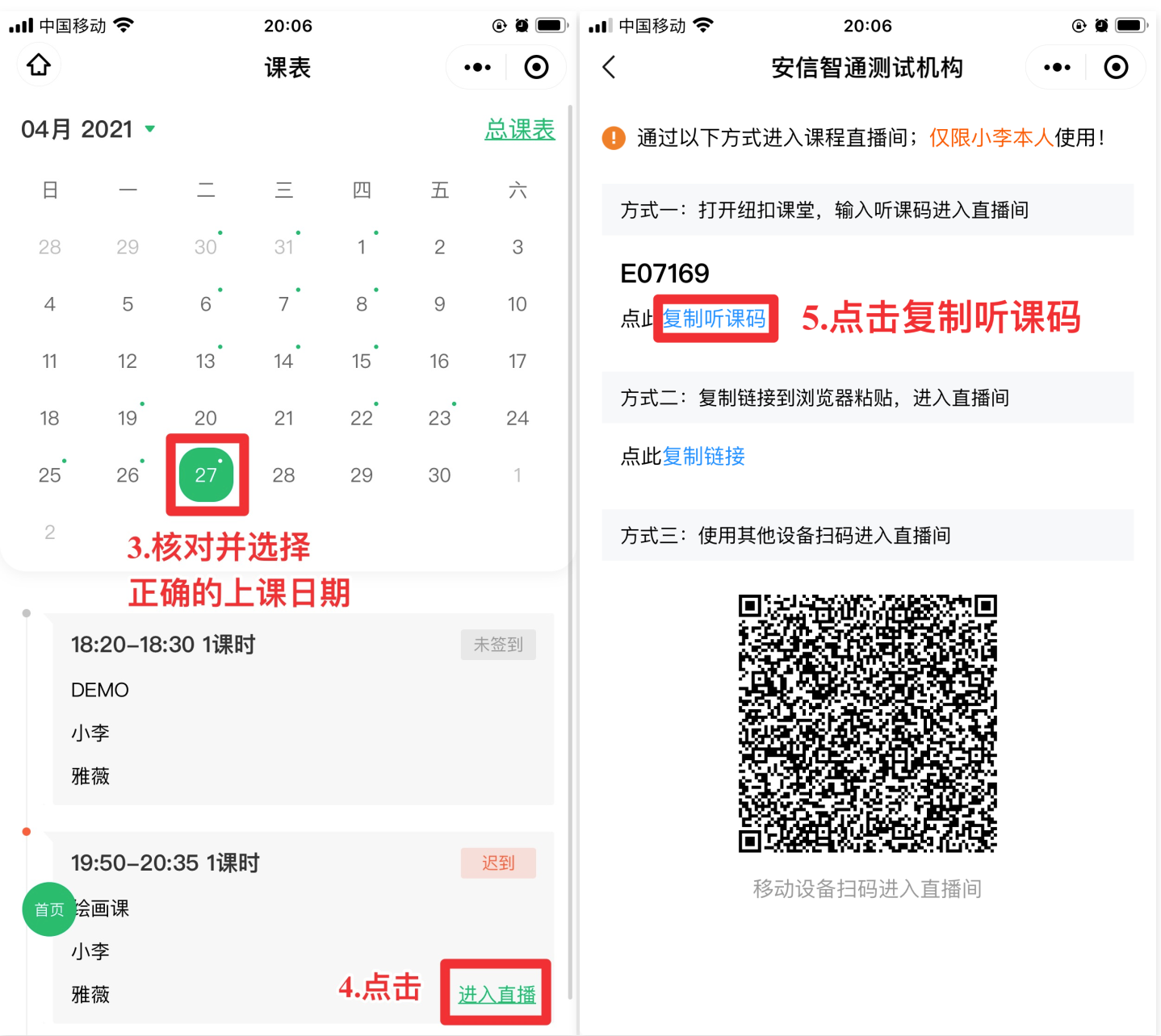 第二步:选择正确的日期-找到需要上的课,点击:进入直播,获取并复制听课码。