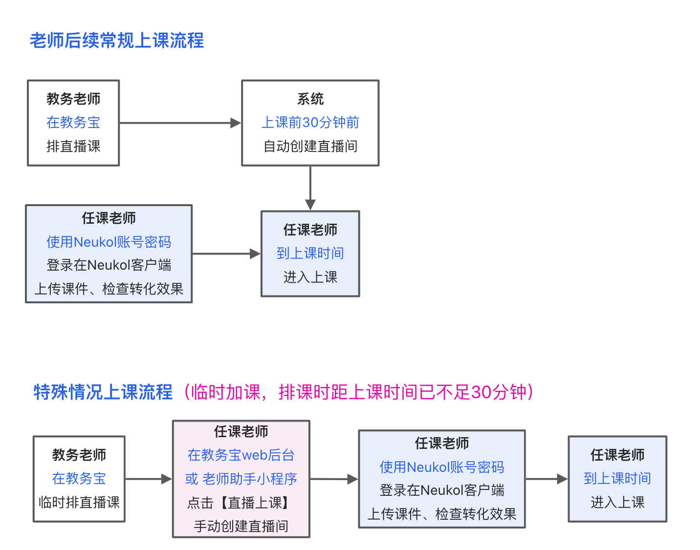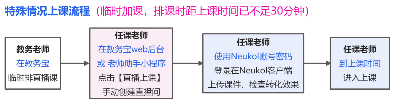 排课距开课时间不足30分钟,系统不会自动创建直播间,此时老师需要手动创建直播间,再到Neukol客户端上课。