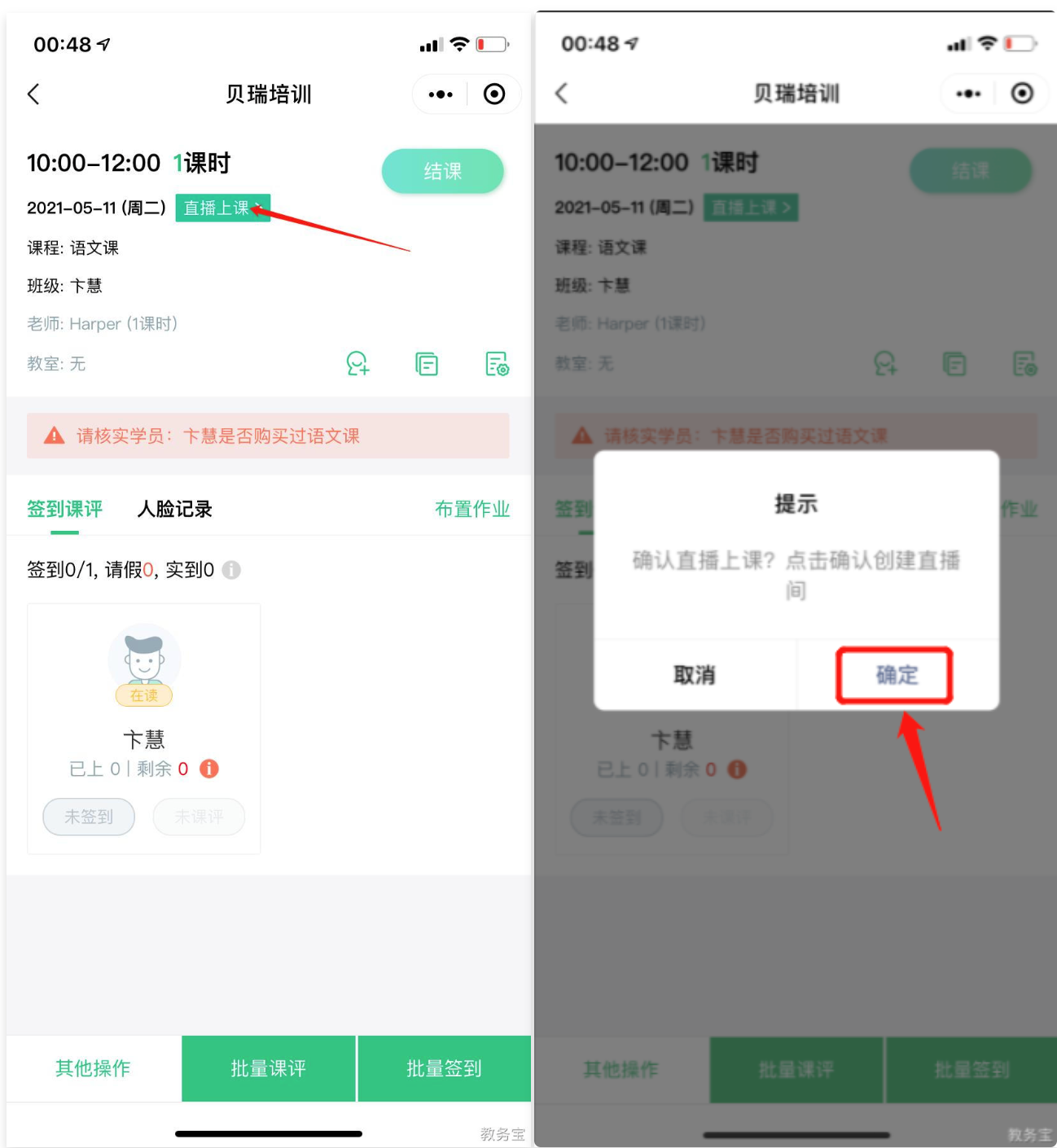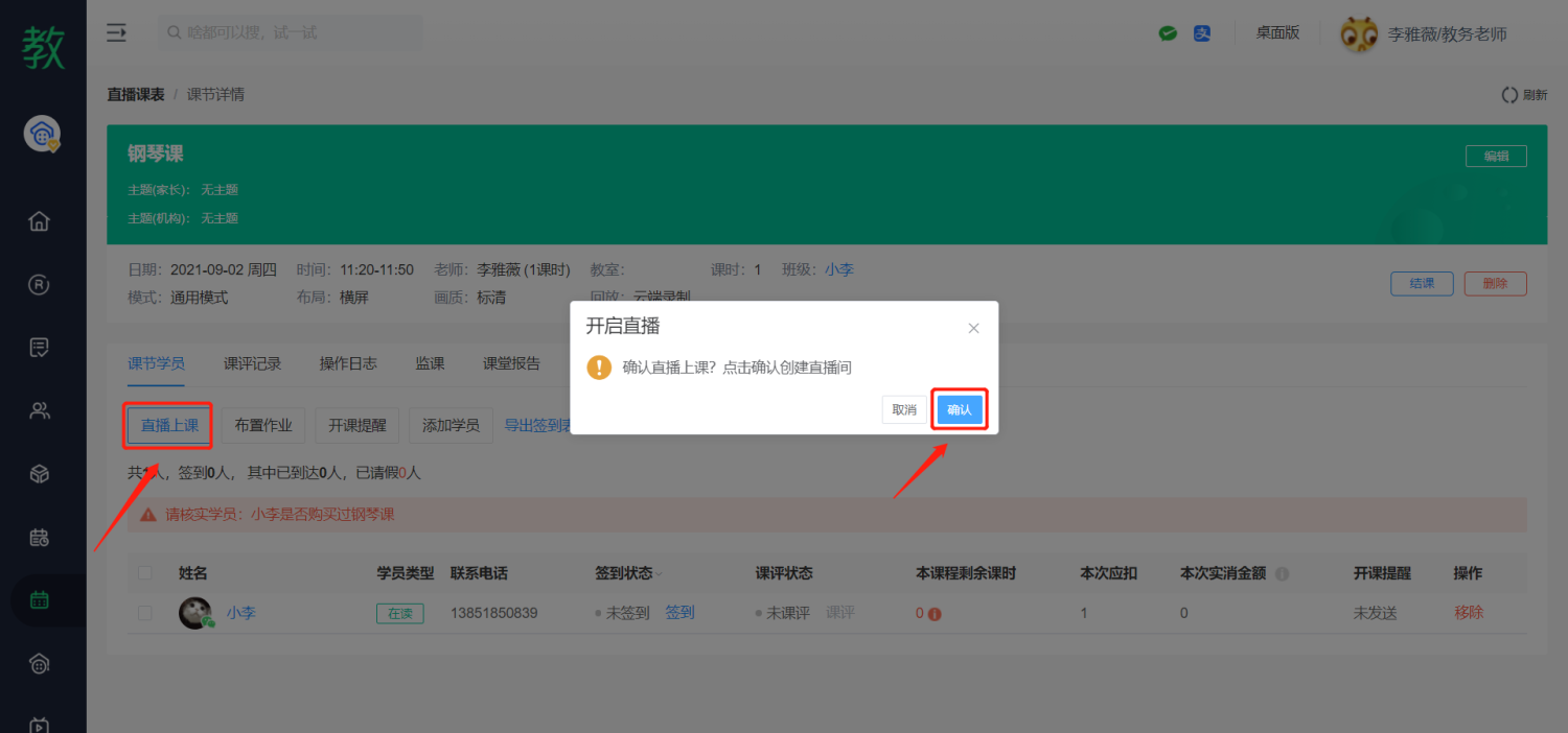 进入课节详情,点击【直播上课】,【确认】创建直播间。
