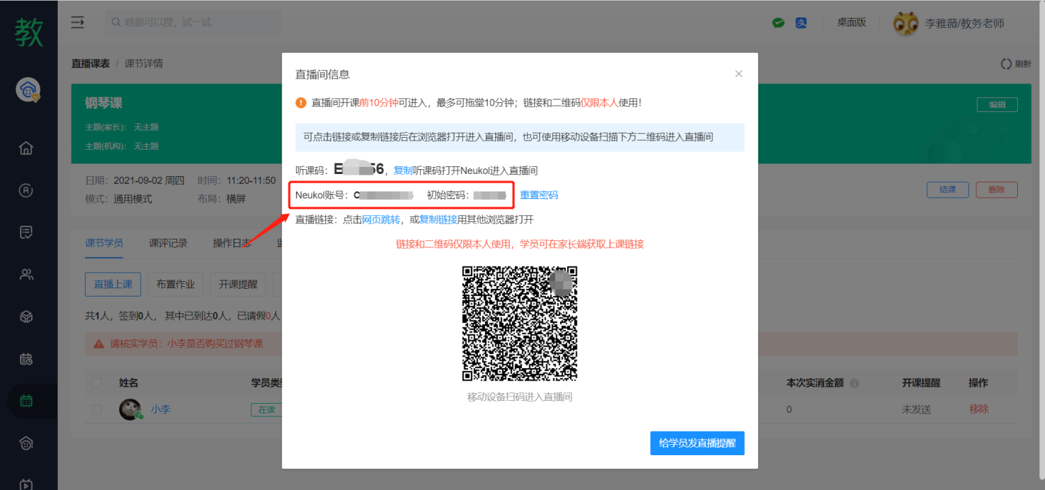 进入课节详情页,点击【直播上课】-【确认】创建直播间,即可获取专属Neukol账号、密码,