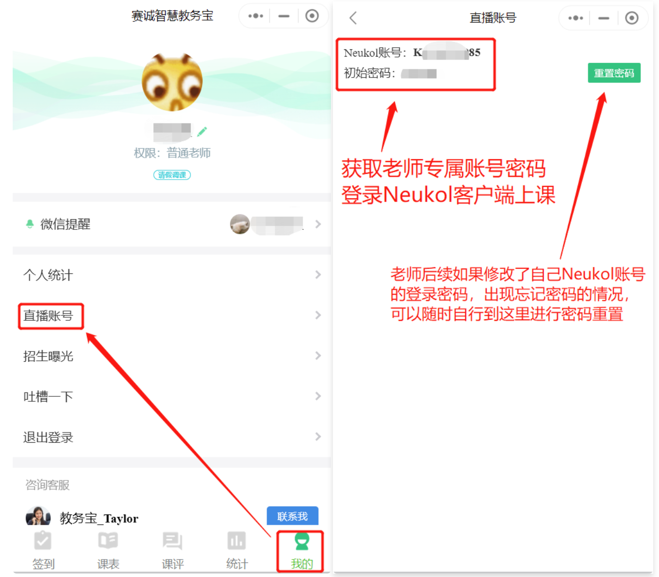 授课老师可以在教务宝web后台和教务宝小程序获取Neukol账号密码。