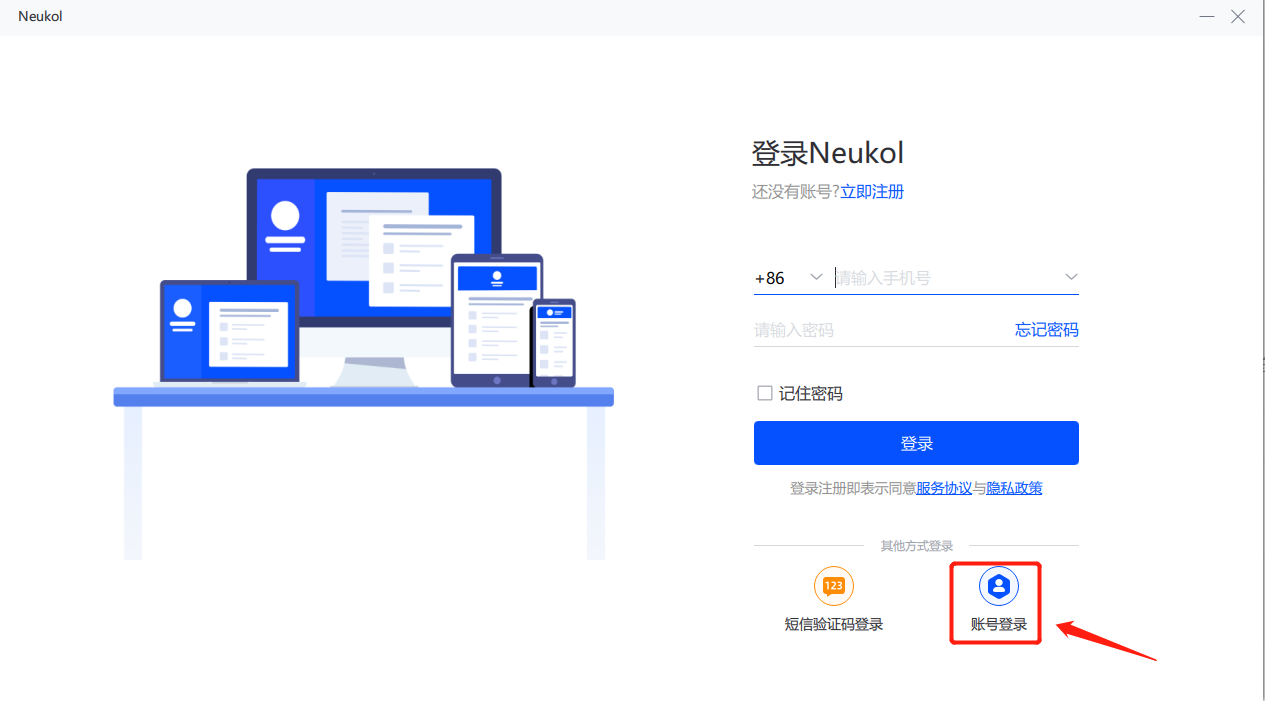 1、打开Neukol客户端,选择账号登录,输入获取到的Neukol账号密码。