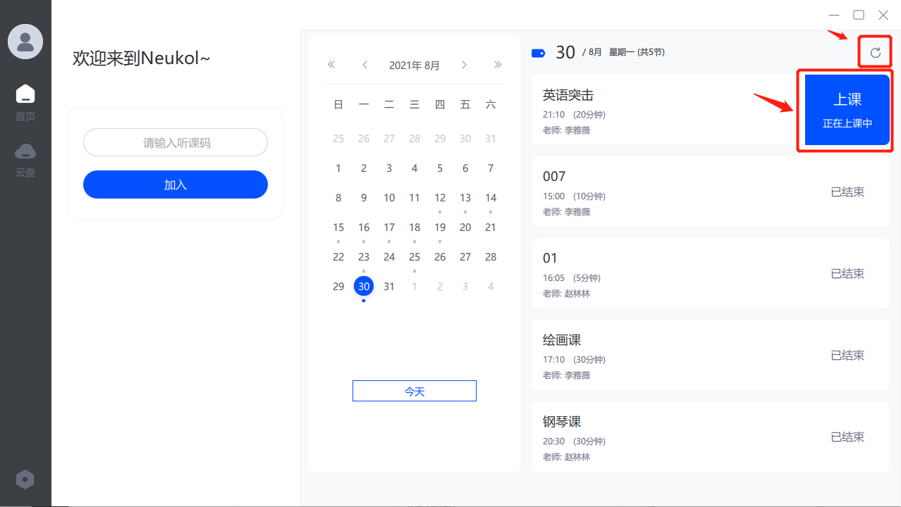 (系统会提前30分钟创建教室,因此不需要太早来查看课表,可以等开课到前30分钟内再点击右上角的“刷新”,查看实时课表。例如:下午2点的课,老师1点打开软件是看不到这节课的,但是1点30以后,就可以看到这节课了。)