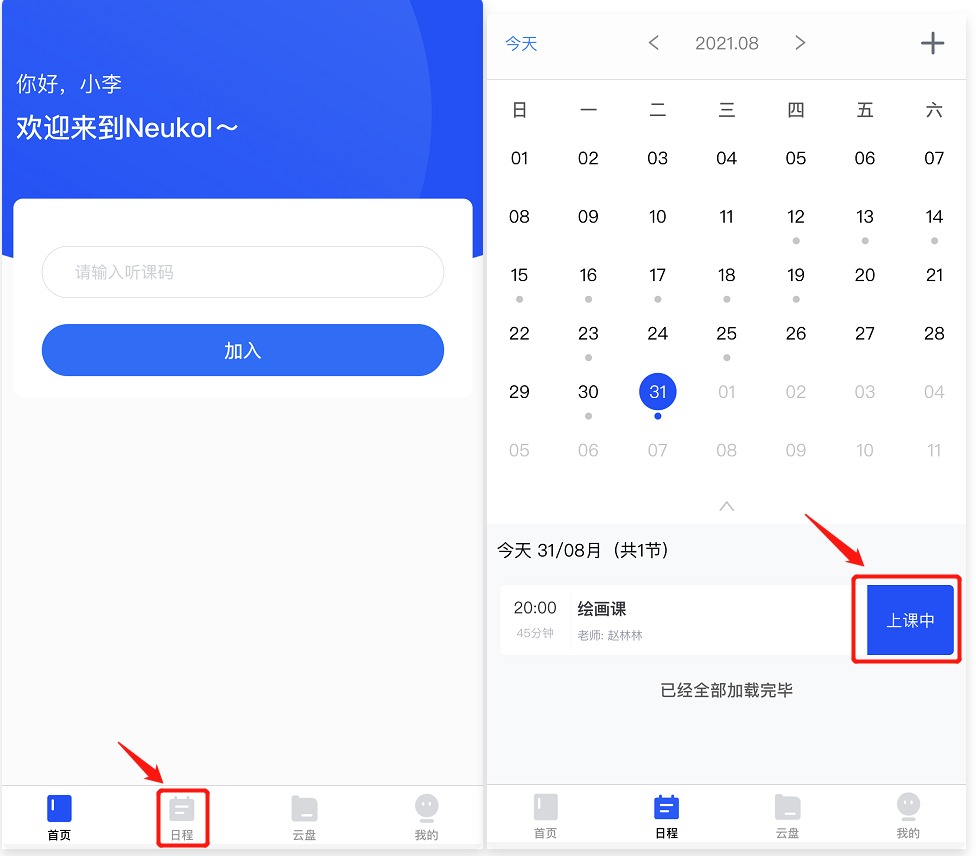 2、点击【日程】,可以看到30分钟内即将开始的课堂,到时间点击【上课】即可入课。
