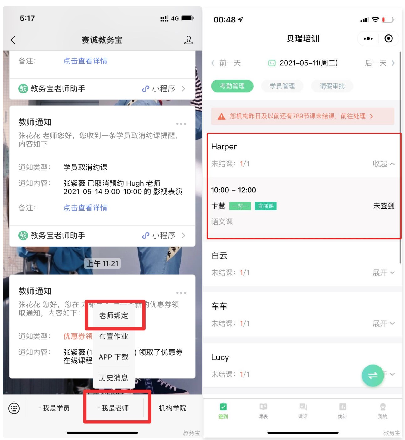 在赛诚教务宝公众号,点击底部菜单【我是老师】-【老师绑定】,进入老师助手小程序,