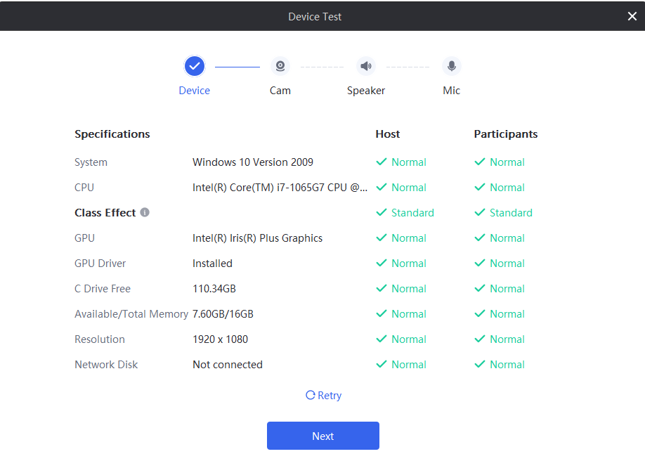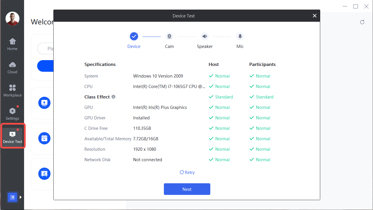 - The Device Test process will be divided into several steps, including device performance, camera, speaker, and microphone checks. Click on the respective icons in the flowchart or use the "Next" button below to proceed to the next step.