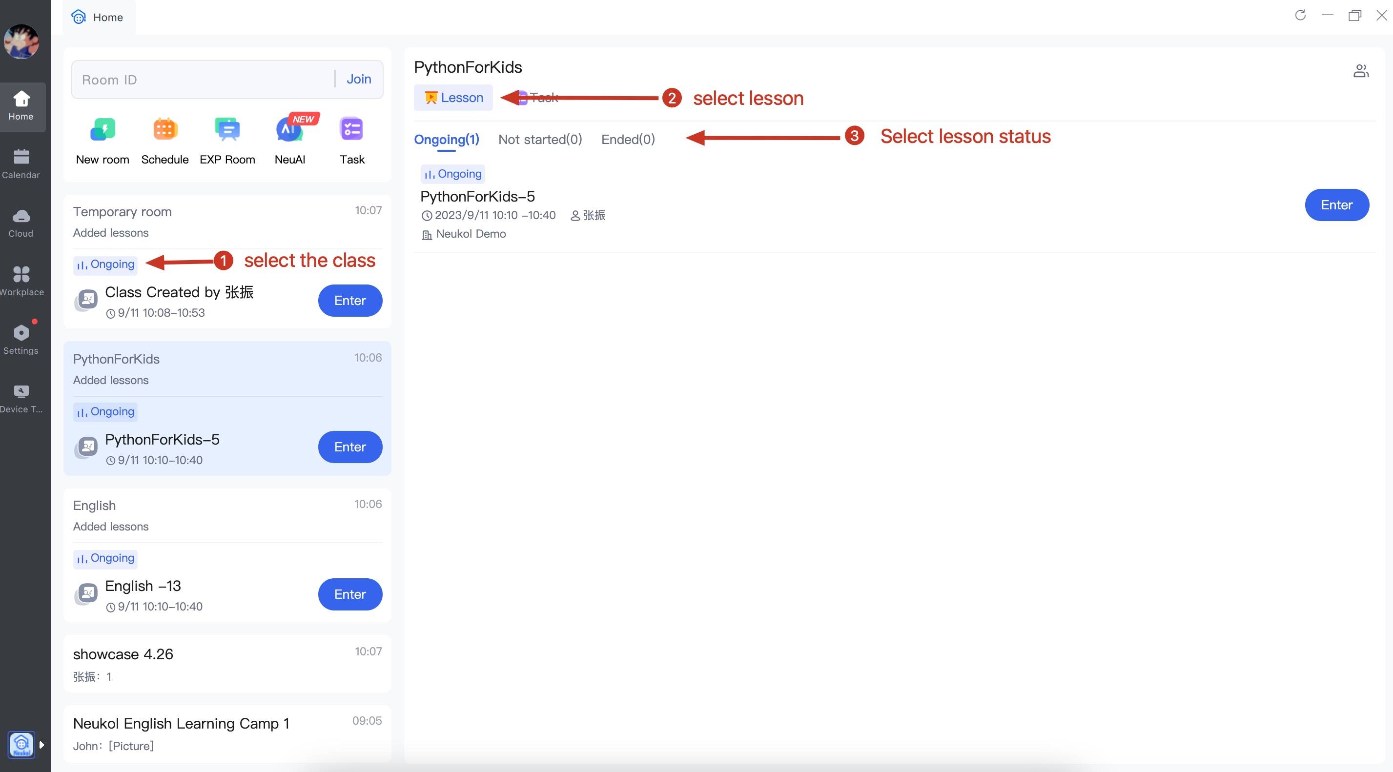 - If there are no not started lessons in the class, the default display is the menu for ended lessons.