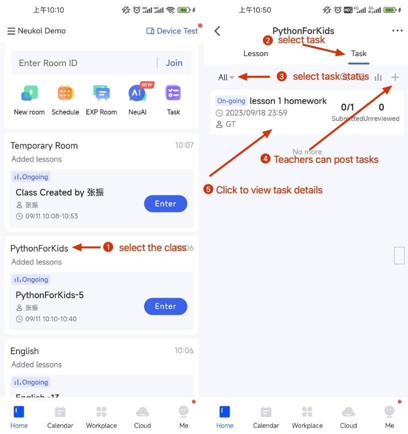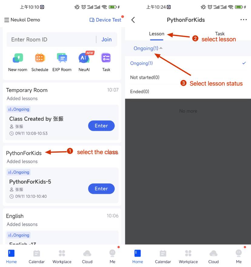Mobile students running Neukol client in the background will exit the classroom, and you will see a prompte on the homepage: locking learning mode has been enabled, Neukol will automatically exit the classroom when running in the background
