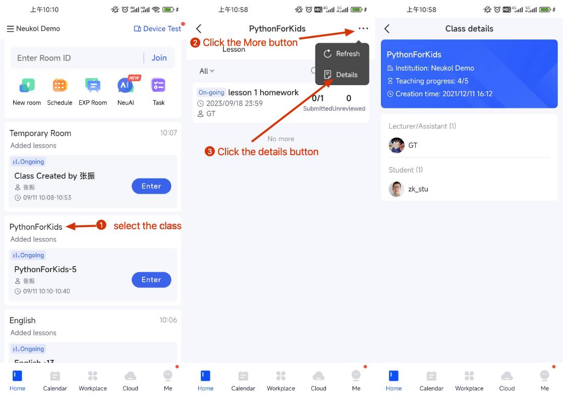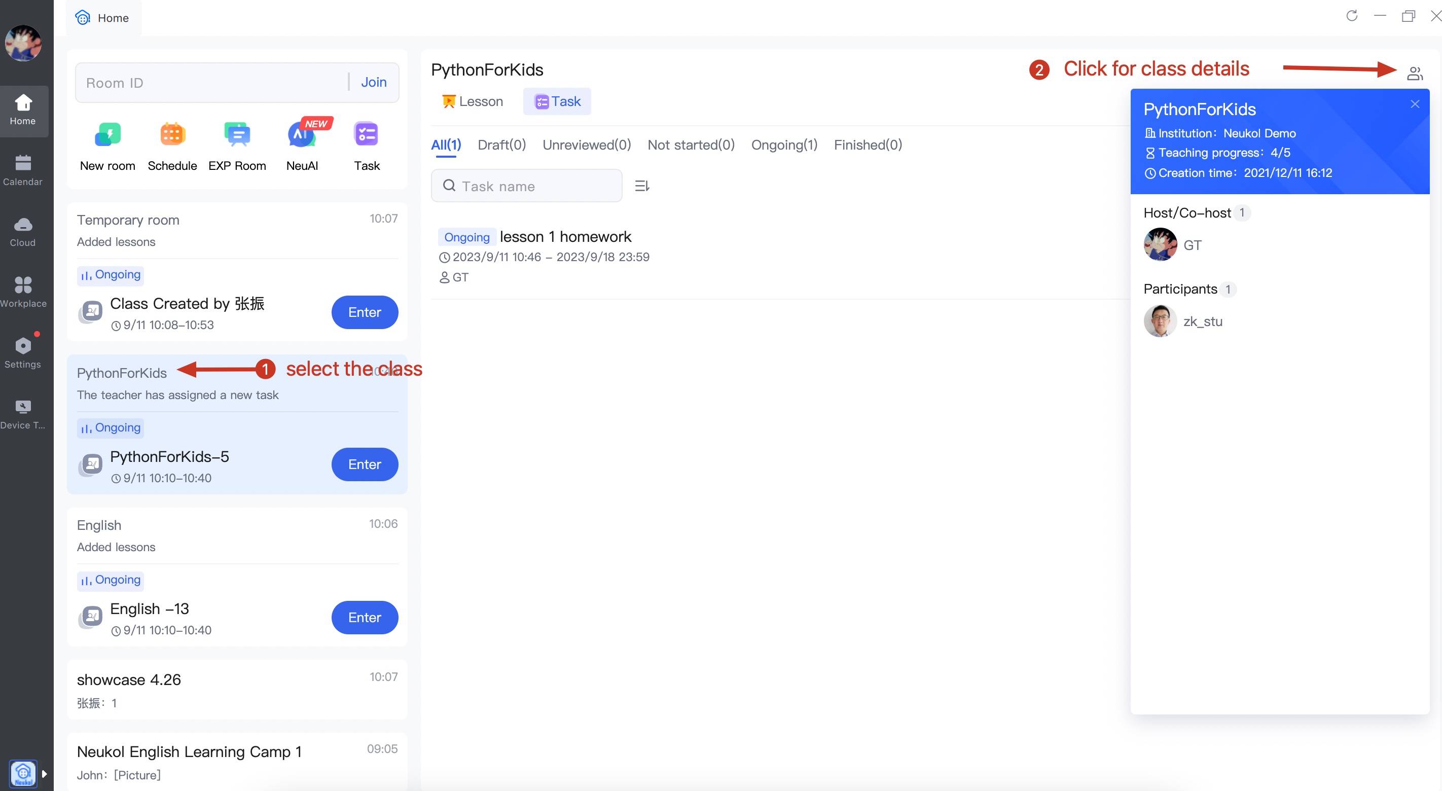 - When clicking on a class with ongoing lessons, the default display is the menu for ongoing lessons.