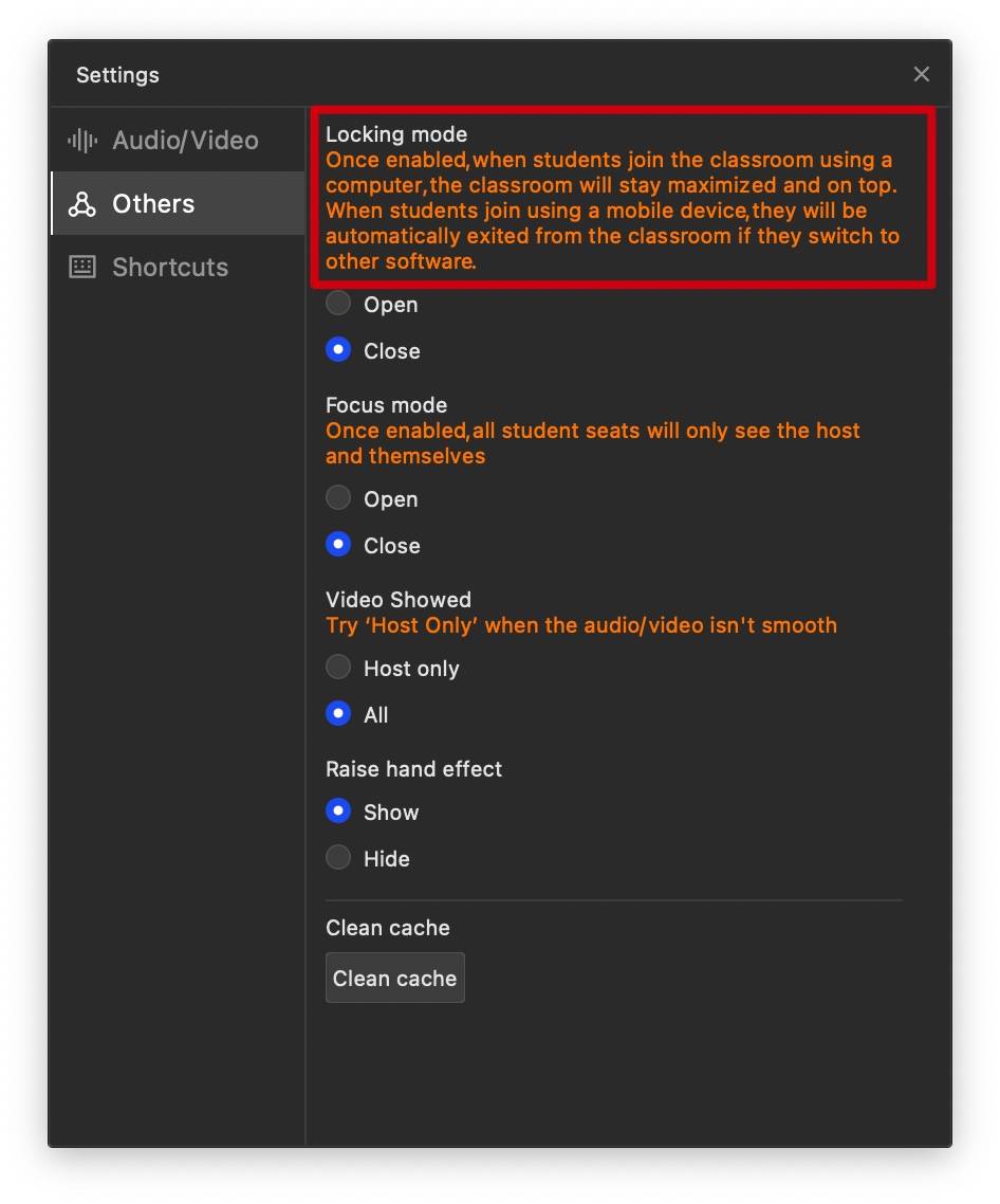 - When the lockinge mode is turned on, the classroom will remain maximized and on top after students enter the classroom using the computer terminal; once students enter the classroom using the mobile terminal, they will automatically exit the classroom once they switch to other software.