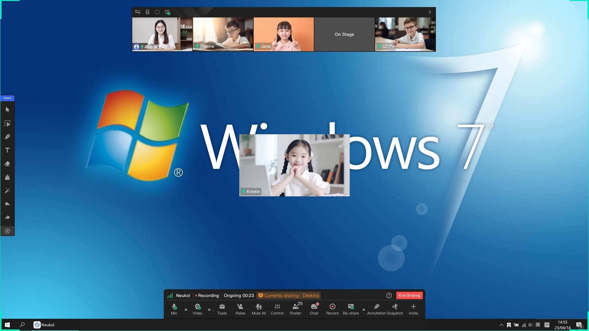 Supports video-on-stage function when desktop sharing, up to 1 person's portrait video can be displayed in the sharing screen.