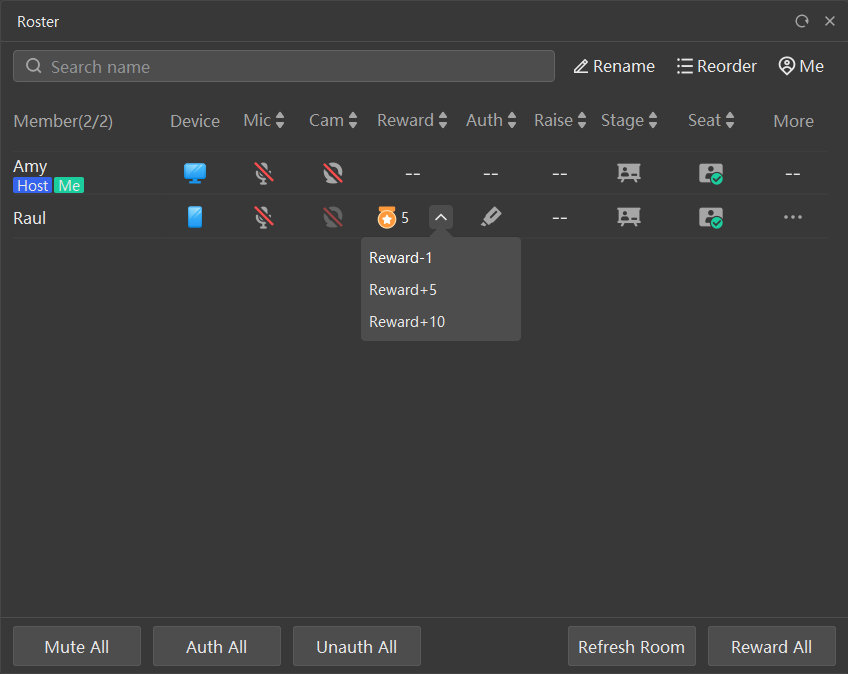 If the student is not on the current page of the seating area or on the blackboard, you can find the student in the "Roster" and click on "Reward -1" to deduct a reward.