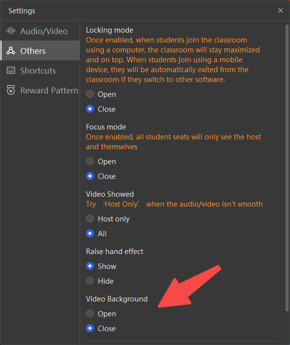 In classrooms with virtual backgrounds enabled, instructors can adjust the virtual background toggle in the classroom settings under "Accessibility." The status of the toggle will be retained on that device.