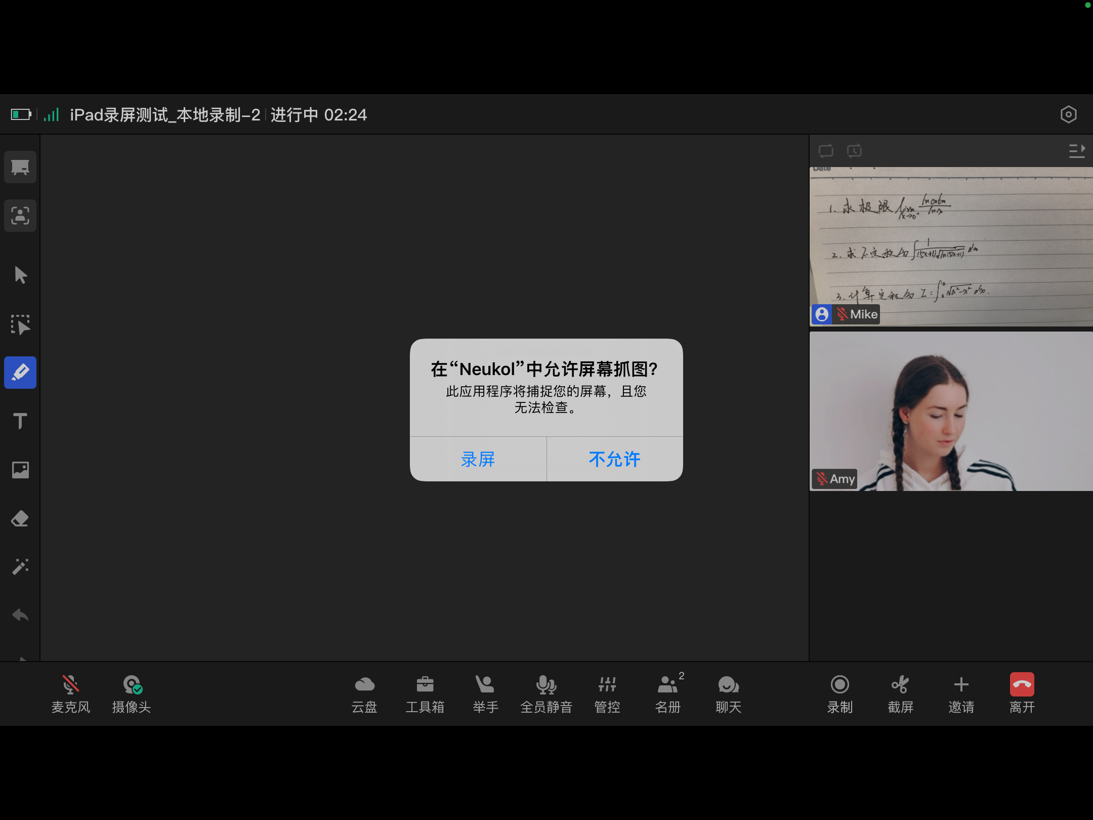 2、iPad首次进入Neukol课堂需要获得录屏权限,方可启用课堂录制功能。