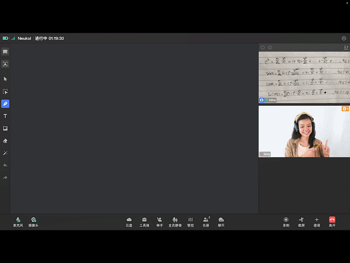 - 点击教室内右下角【离开】,在提示弹框内,勾选【离开并结束课堂】,再点击【确定】。