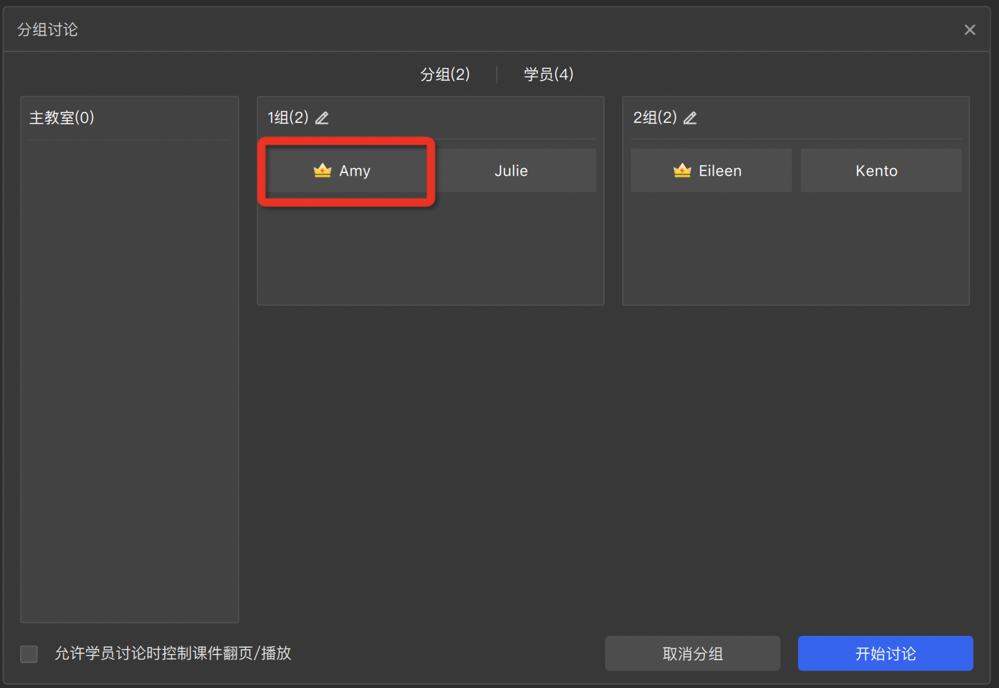 - 后续进入课堂的学生默认在主教室内,老师可以手动将学生移入指定分组。