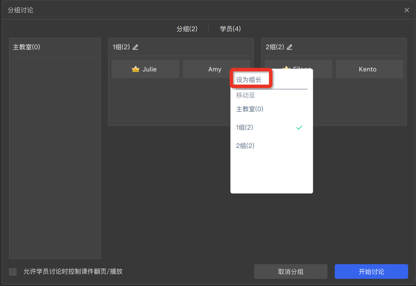- 更换分组组长:讲师电脑端鼠标右击/iPad端手指长按,选择【设为组长】将学员设置为分组组长,原组长自动变为组员。