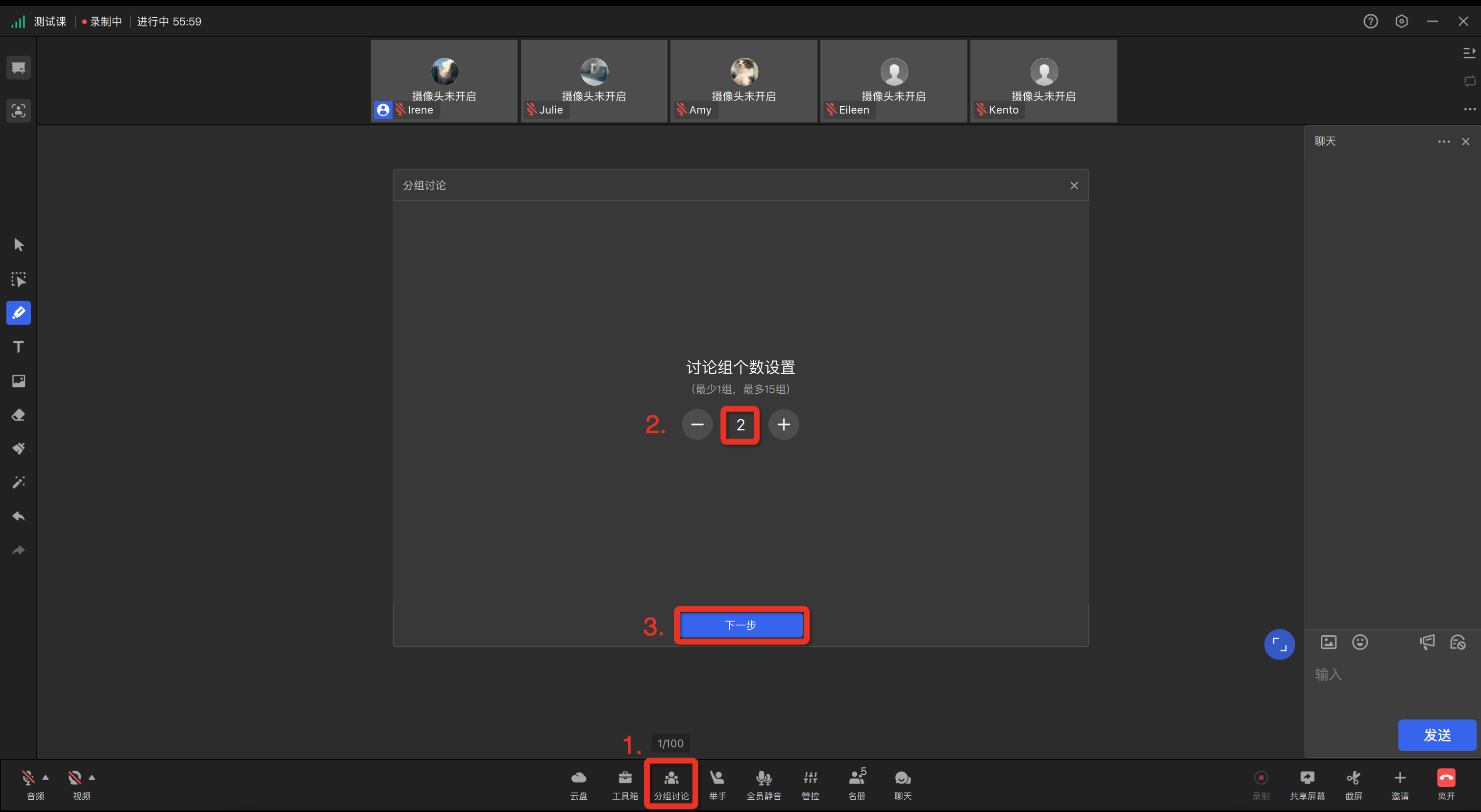 讲师直接从管控栏点击【分组讨论】,设置分组数量,并点击【下一步】,即可创建新的分组讨论。