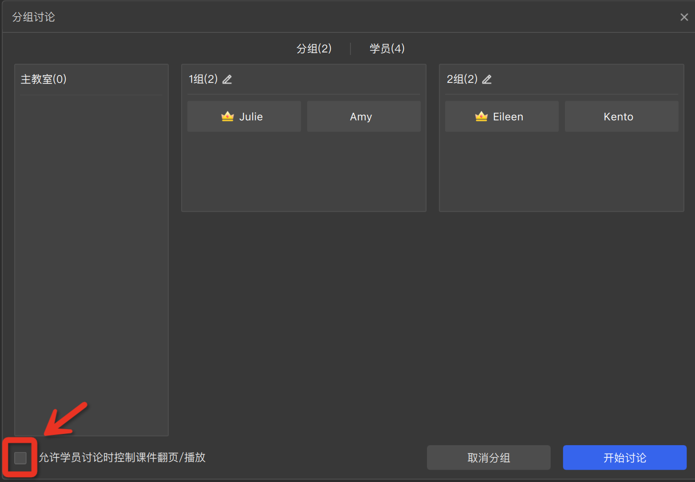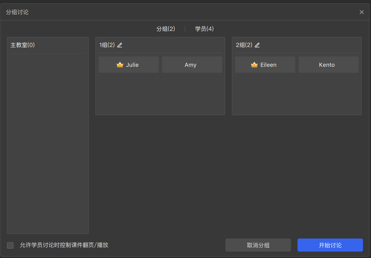 - 在分组讨论中需要学员在讨论组内控制课件的翻页/播放,可在任意时刻勾选弹窗左下角的【允许学员讨论时课件翻页/播放】。
