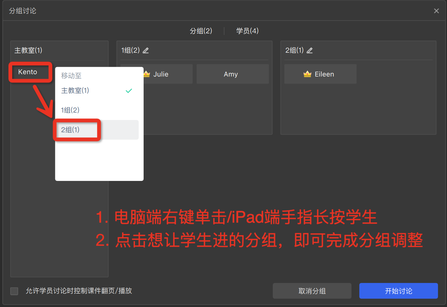 - 调整学员所在分组:讲师电脑端鼠标右击/iPad端手指长按学员名称,点击目标分组名称,将学员移入分组或主教室。