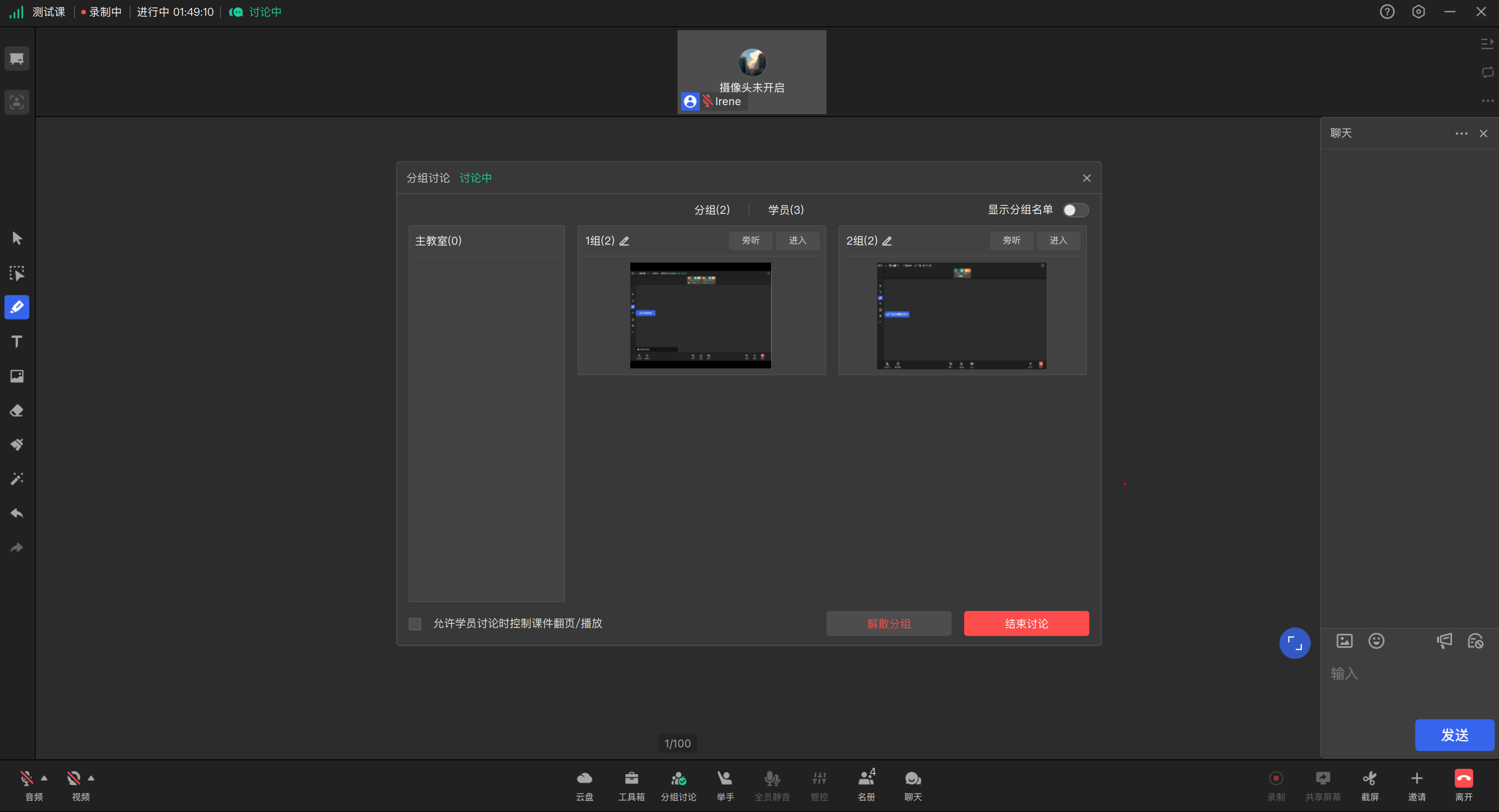 当讲师需要旁听某一个分组中的讨论内容时,可点击该分组窗口上方的【旁听】,此时讲师的音视频不会出现在分组教室中,且可以正常听到分组中学员们的讨论内容。