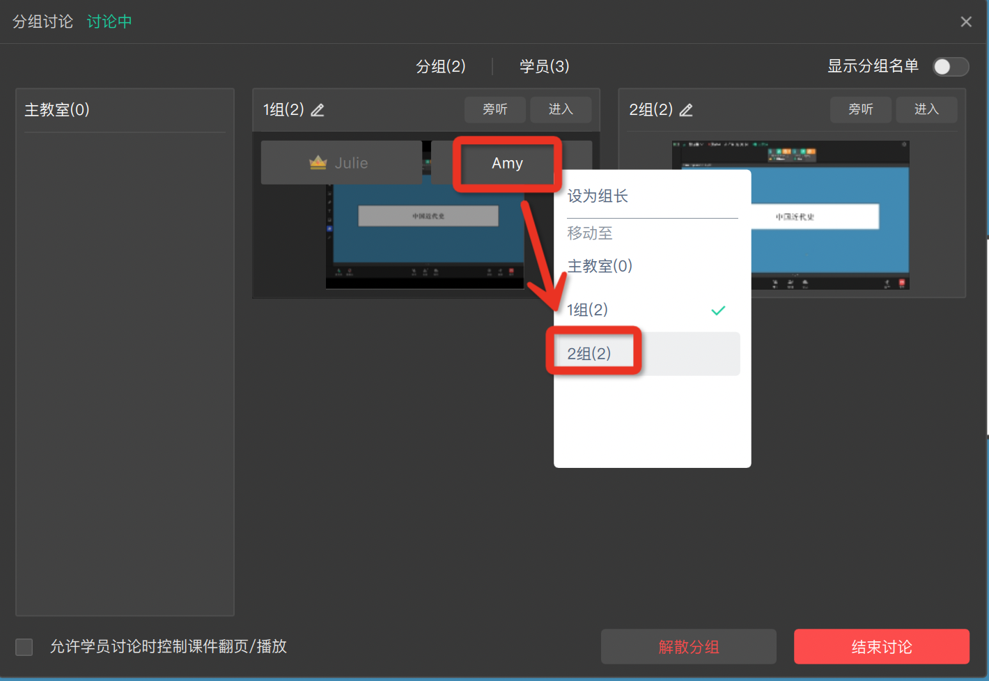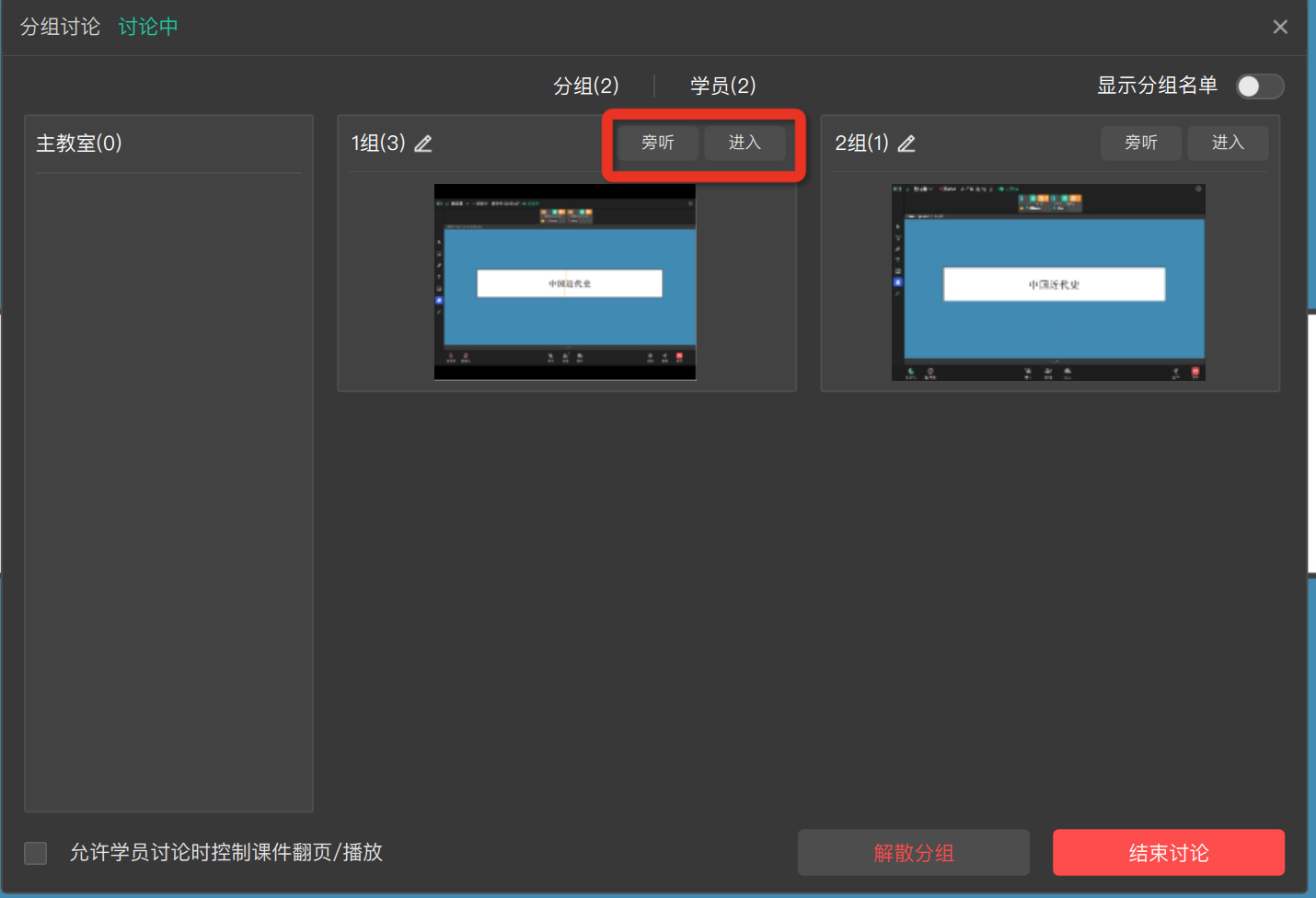 当学员讨论结束后,讲师可以点击弹窗右下角【结束讨论】,关闭分组教室回到主教室。