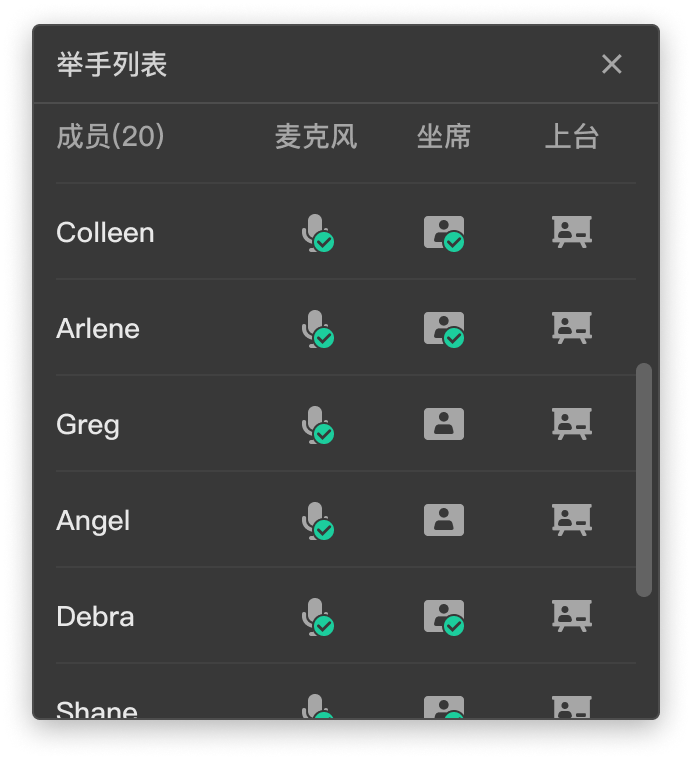讲师/助理点击【举手】图标,可查看举手学员列表,让举手学员开麦、上台互动。