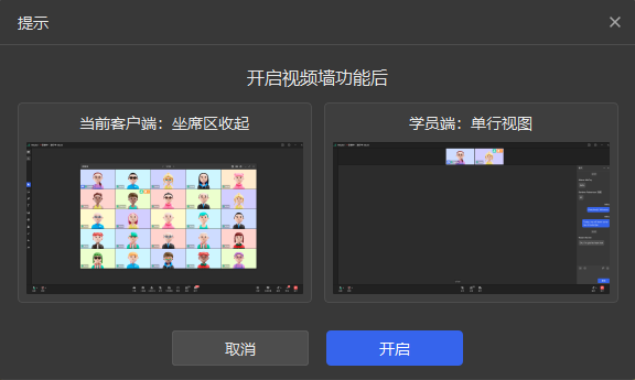 教室内讲师/助理有一人开启视频墙后,讲师/助理不可调整坐席区视图及人数。